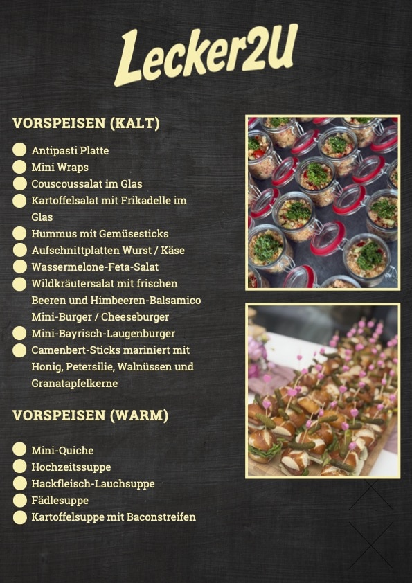 Zusätzlich gibt es bei uns gesunde Vorspeisen, wie Couscous Salat und Wildkräutersalat, und für jede Gelegenheit passende Snacktables. Bei Lecker2U ist für jeden Geschmack etwas dabei. Wir freuen uns darauf, dich mit unseren sorgfältig zubereiteten Speisen zu verwöhnen. Besuch uns und überzeuge dich selbst!
