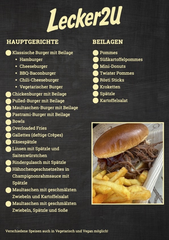 Bei Lecker2U geht es um ehrliche, gute Küche. Wir konzentrieren uns darauf, Euch Qualitätsgerichte anzubieten, indem wir sorgfältig ausgewählte, hochwertige Zutaten verwenden. Unsere Spezialität sind hausgemachte Burger und frische Pommes. Wir bereiten unsere Burger mit frischem, geschmackvollem Rindfleisch zu, das wir liebevoll würzen und grillen. Dazu bieten wir richtig knusprige Pommes, die aus handgeschnittenen Kartoffeln frisch frittiert werden.