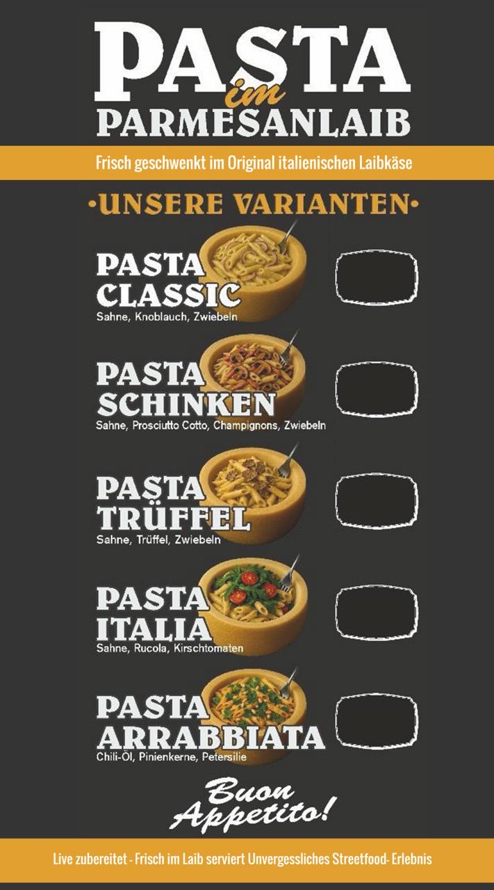 Unser Angebot richtet sich an Besucher, die Wert auf frisch zubereitete, hochwertige Speisen legen. Im Mittelpunkt steht dabei die Pasta im Parmesanlaib – direkt vor den Augen der Gäste zubereitet. Der Duft des geschmolzenen Parmesans und die frische Zubereitung sorgen nicht nur für ein kulinarisches, sondern auch für ein visuelles Highlight.